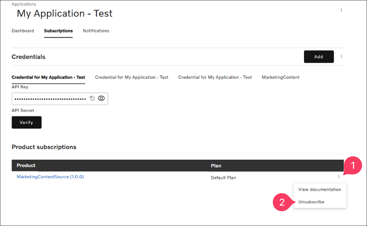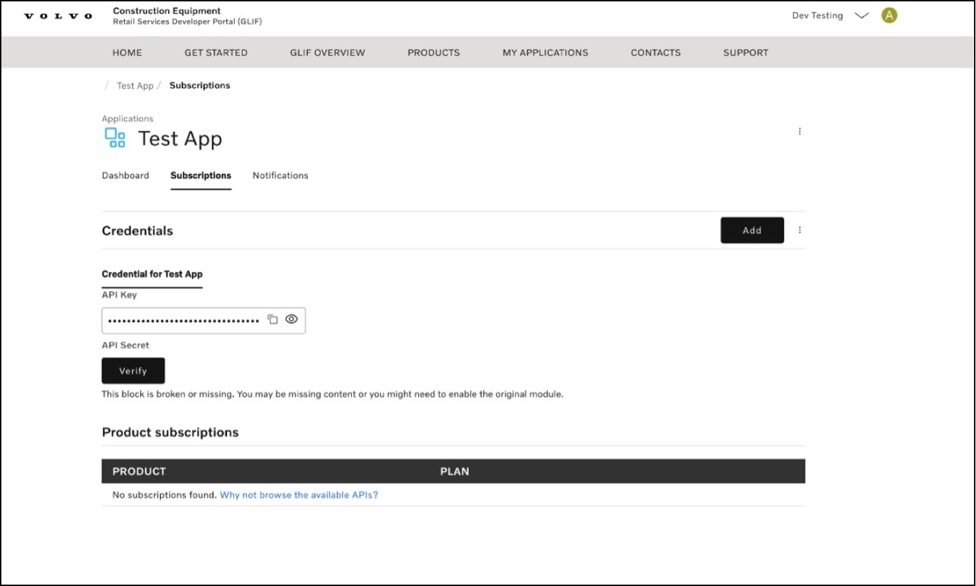 - Select the appropriate application, then select “Subscriptions”. Here, you can copy the API Key. Note that the API Secret is only shown when the app is first created.
